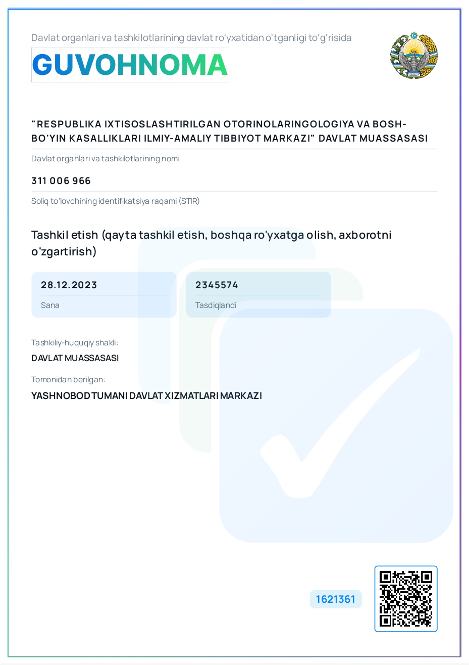 Otorinolaringologiya xizmatini takomillashtirish va uning ko‘lamini kengaytirish chora-tadbirlari to‘g‘risida